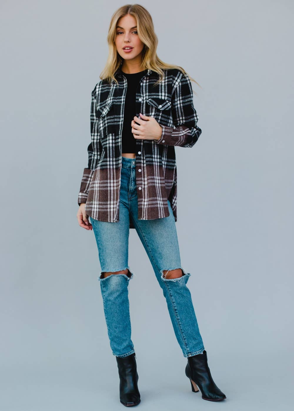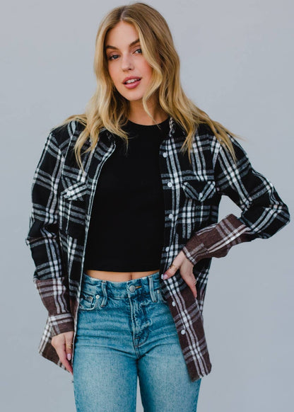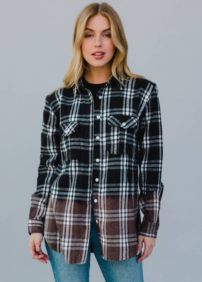 Experience the perfect fit with our black and white plaid flannel, crafted from 100% cotton and featuring a unique bleached dipped contrast. This flannel blends comfort and style effortlessly, making it your go-to choice for everyday wear.